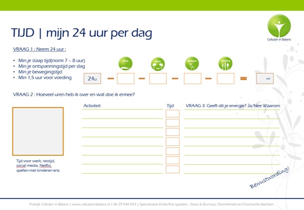 Vanuit een gezondheidsperspectief hebben wij een paar basis dingen echt nodig; slaap, ontspanning, beweging en voeding. De andere uren zijn specifieke keuzes dat invloed heeft op hoe wij leven. Dit kan heel bewust zijn of juist niet.
